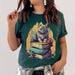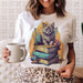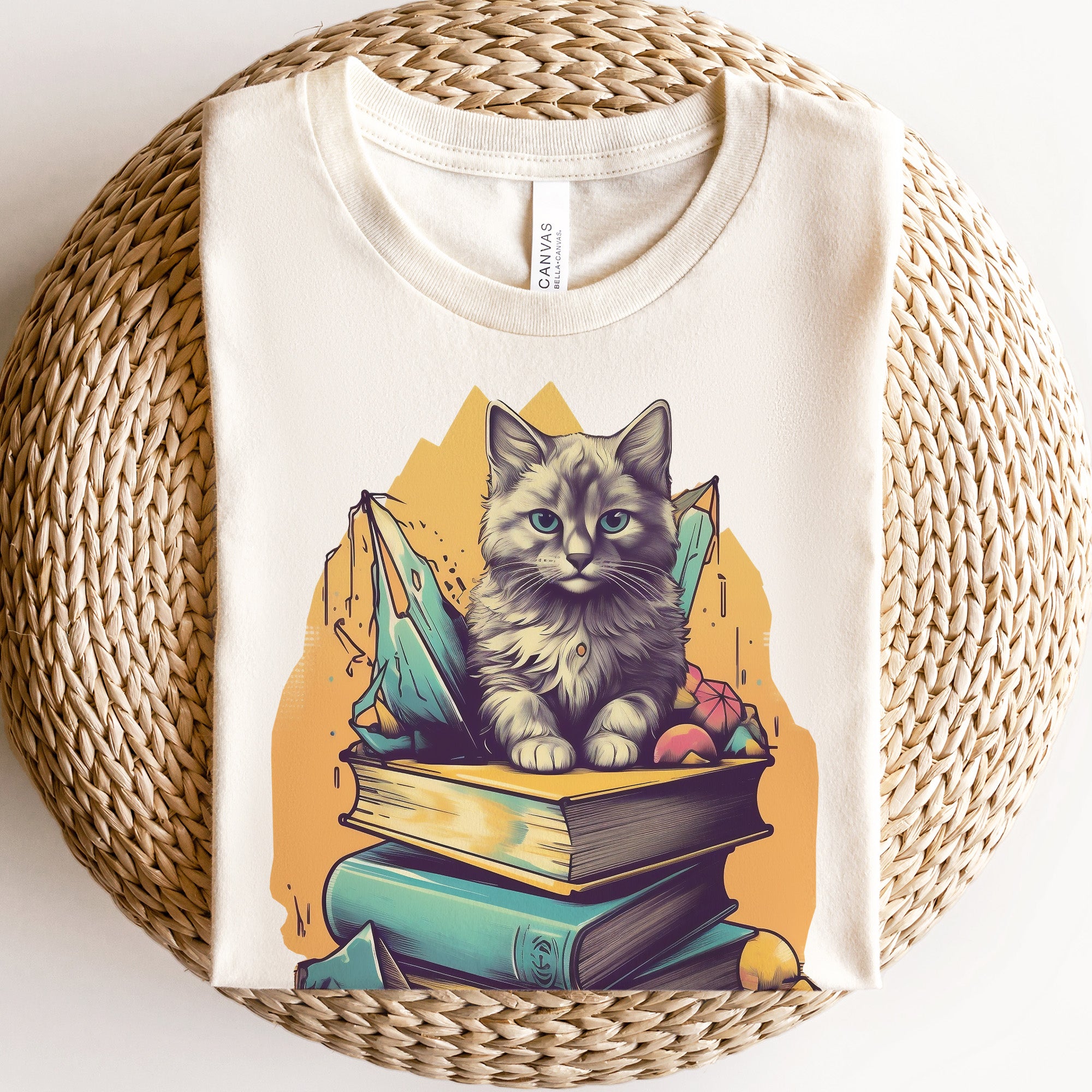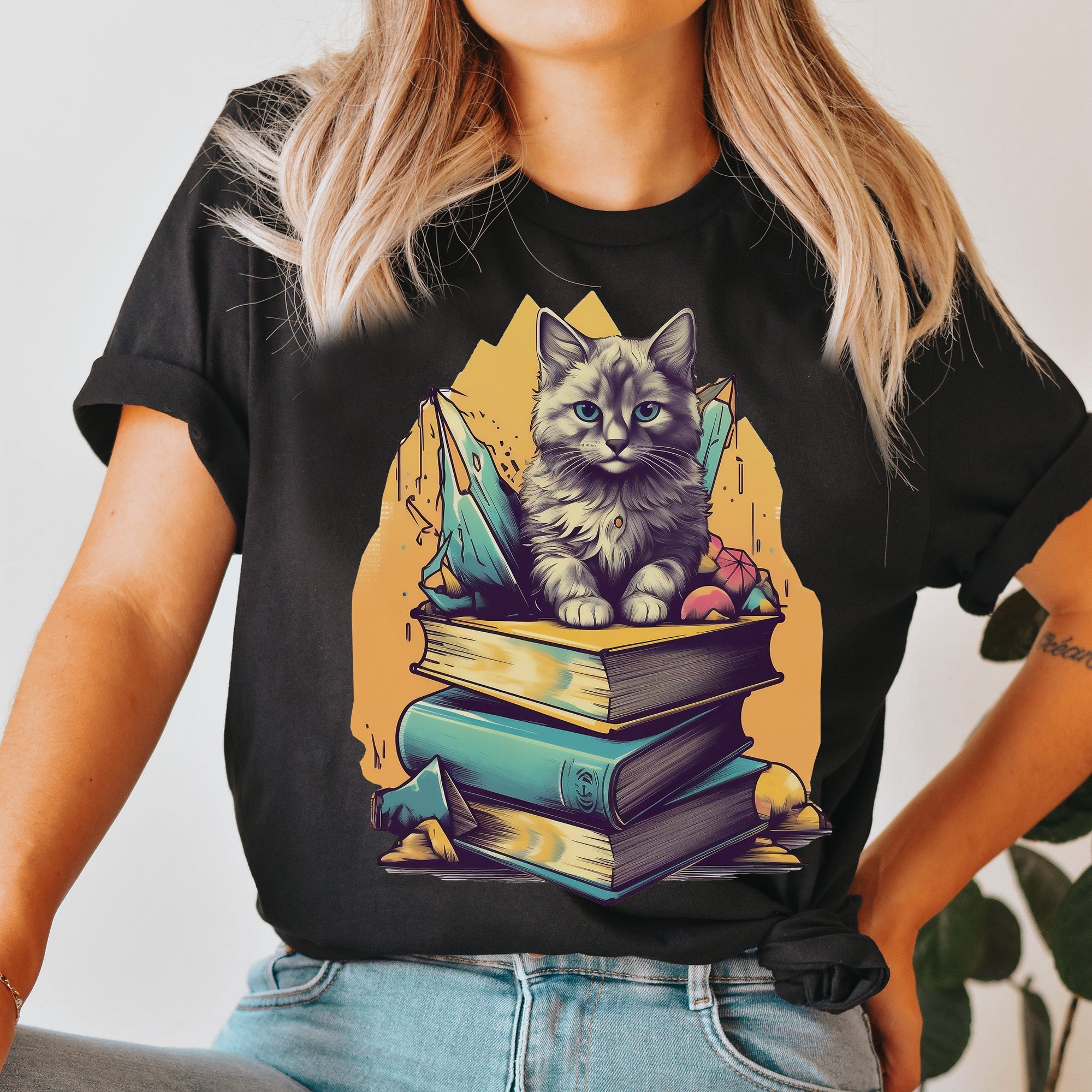 This bookish shirt features a cat sleeping books illustration, perfect for kitten can lady, as librarian gift or for reading teacher.