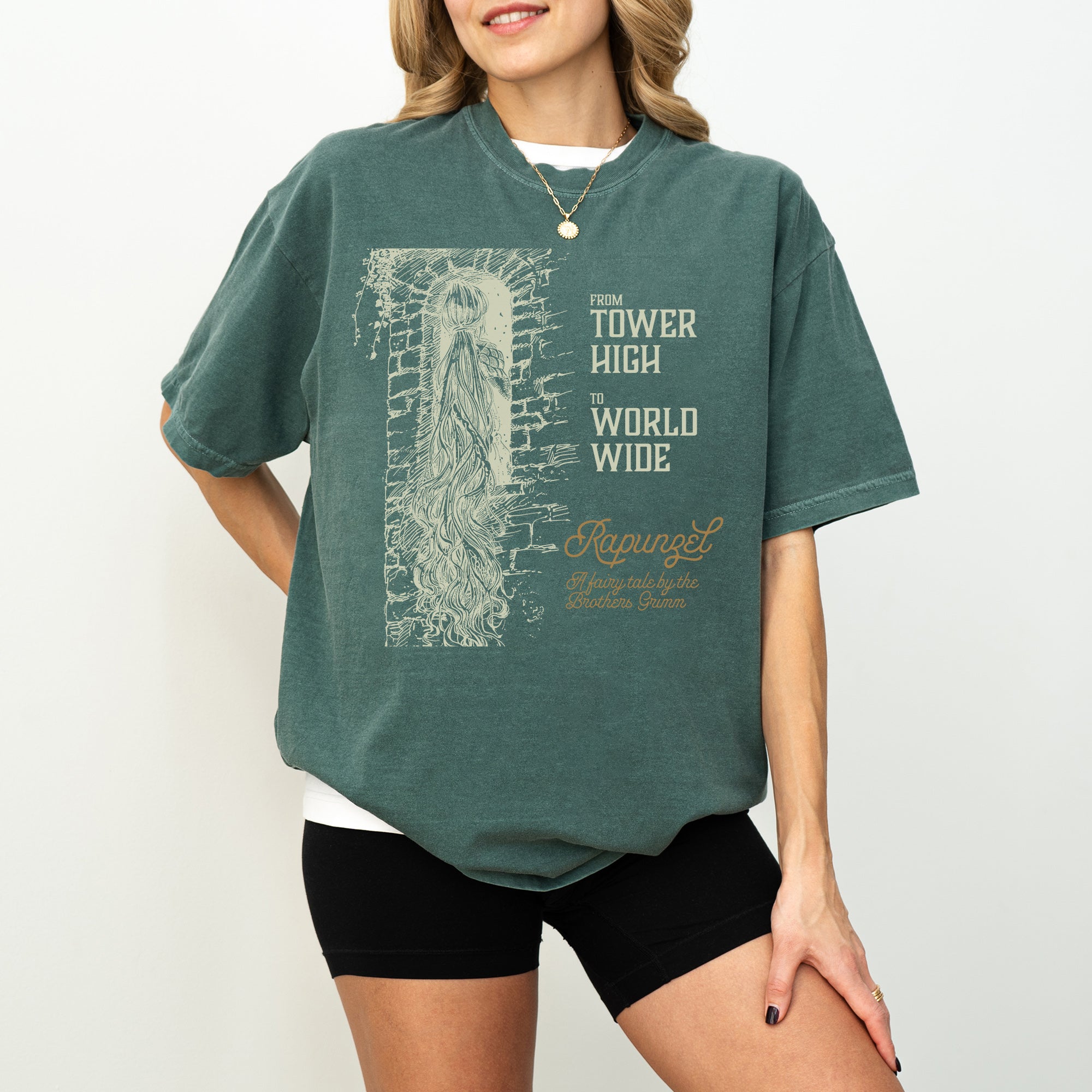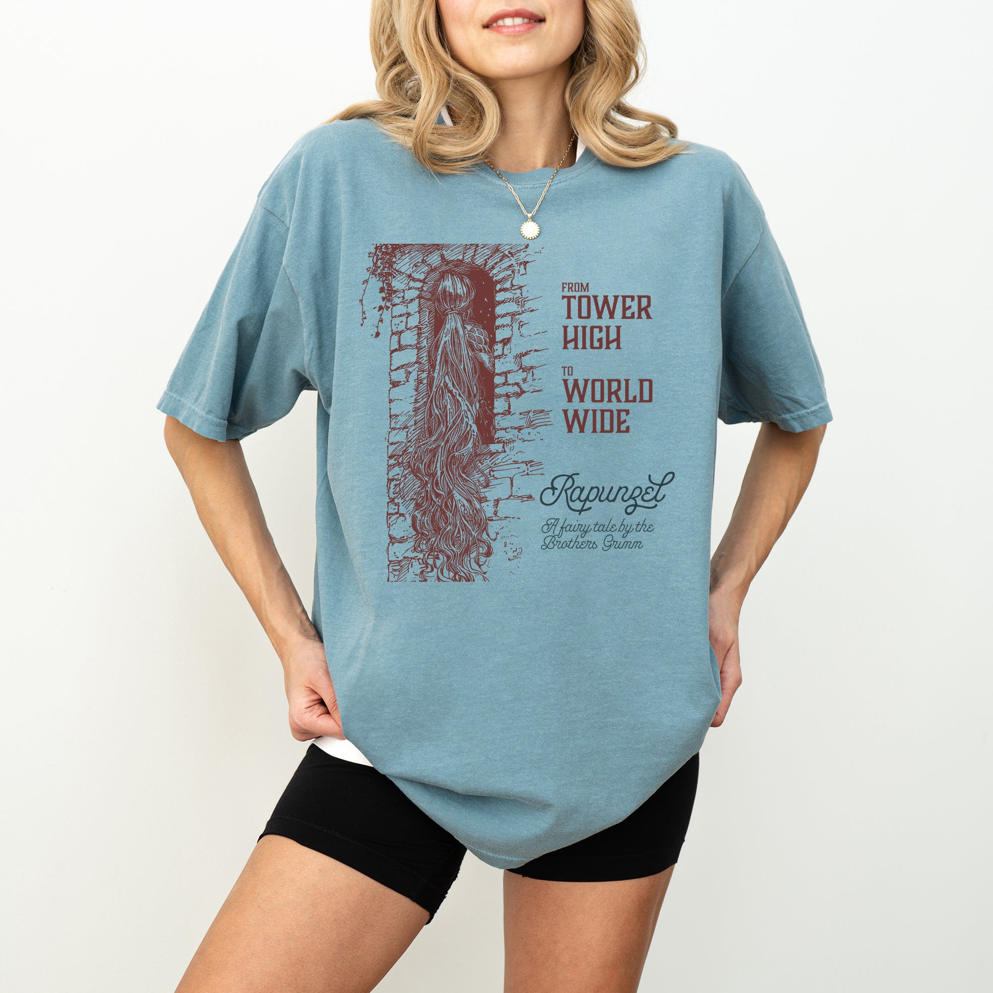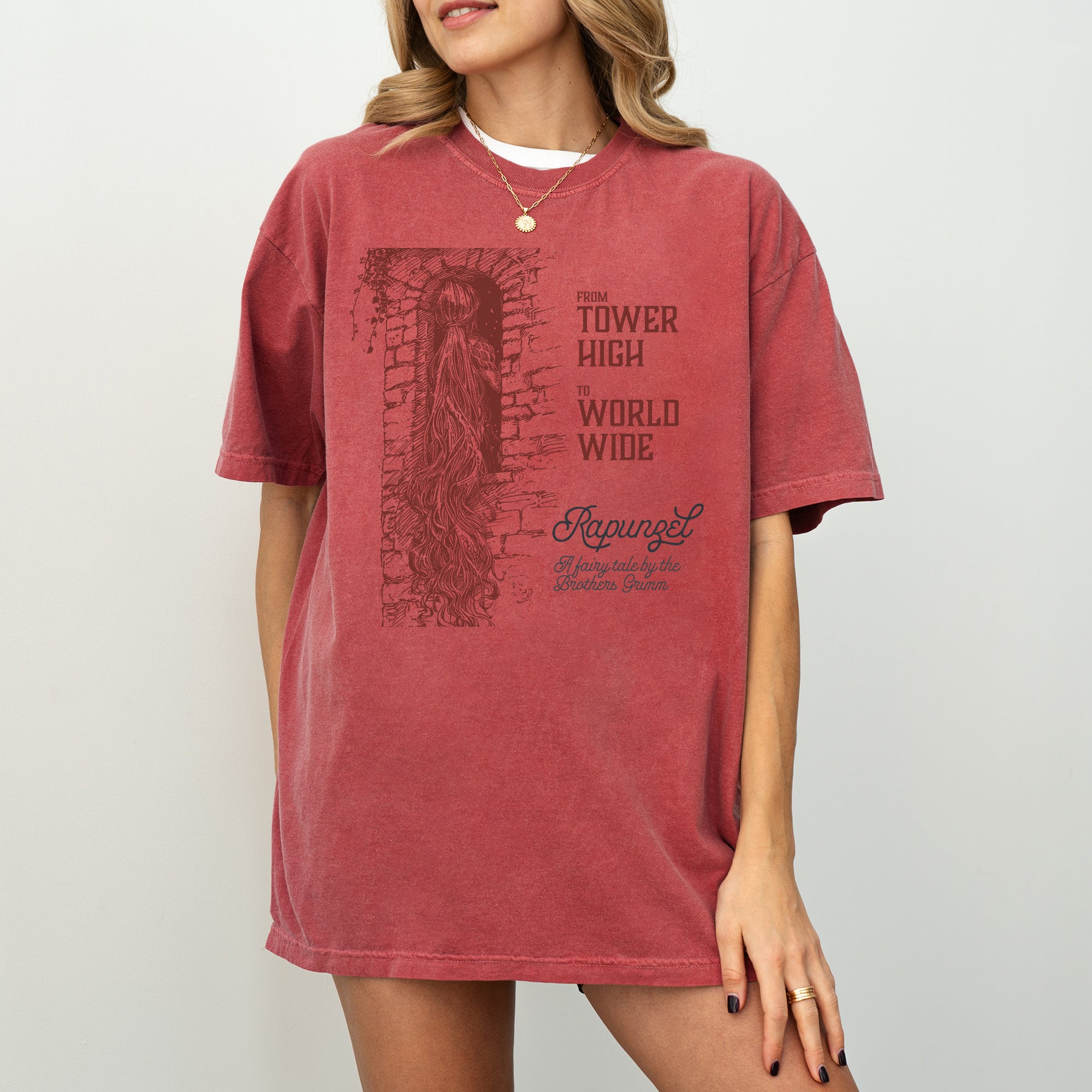 This Rapunzel shirt is inspired by the children's book Fairy Tales written by The Brothers Grimm. The book is now in the public domain.