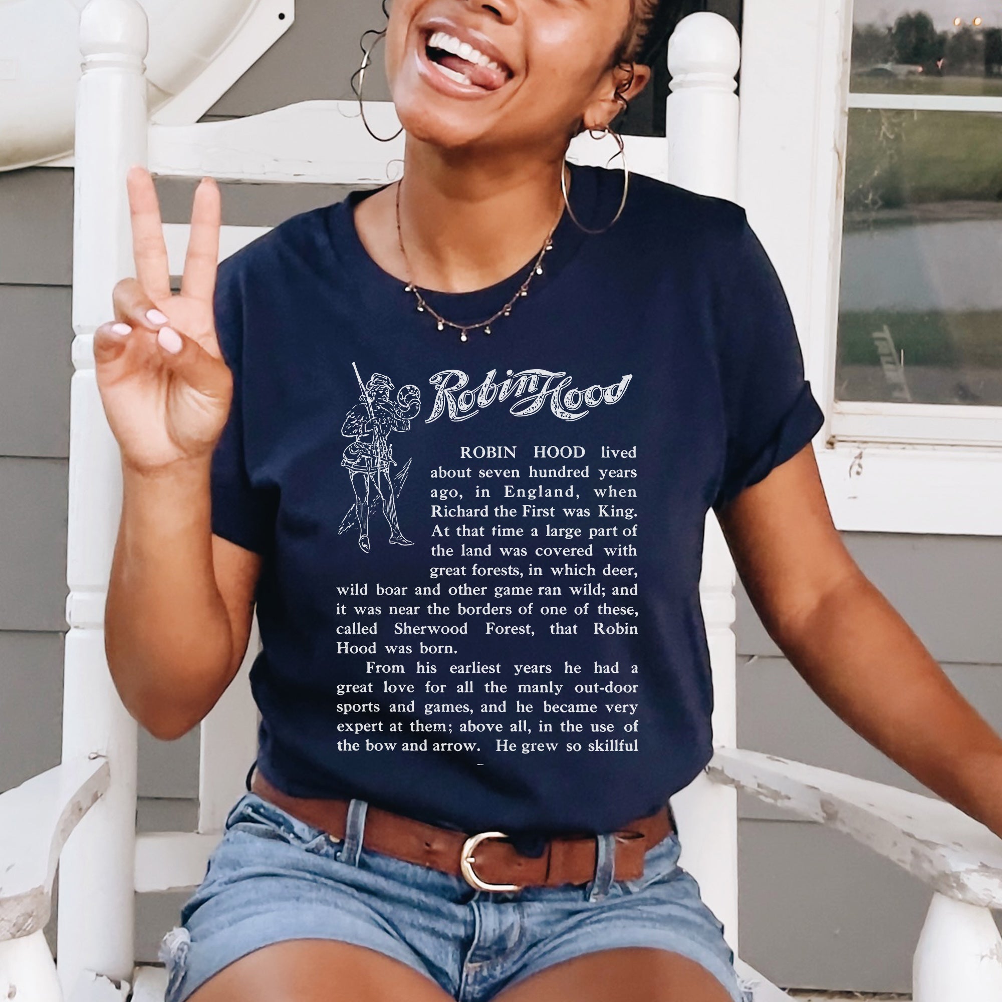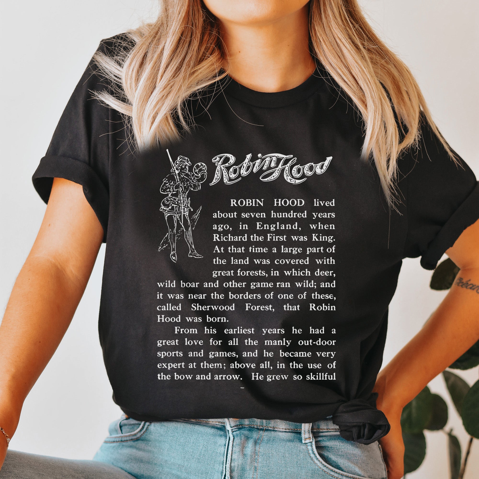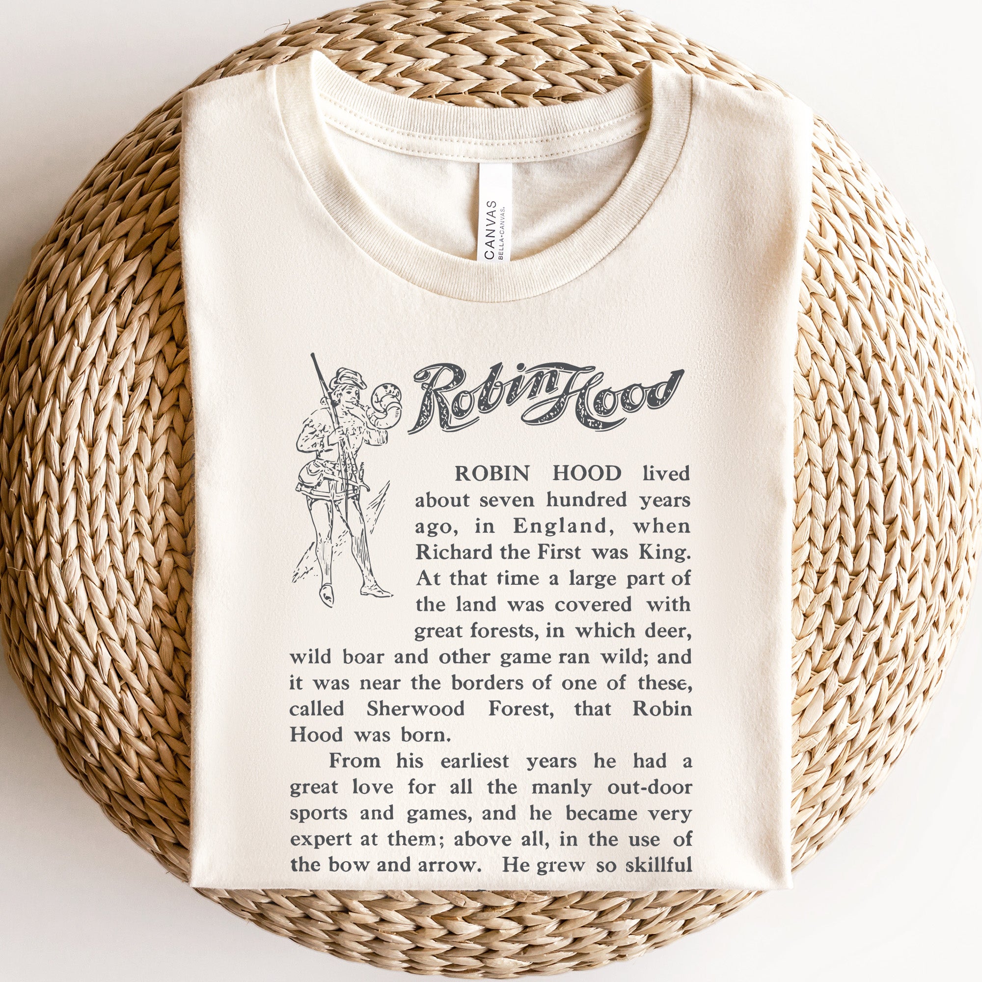 This Robin Hood shirt features the iconic first page of the first English edition of the book. It is inspired by the classic children's book. The book is now in the public domain.