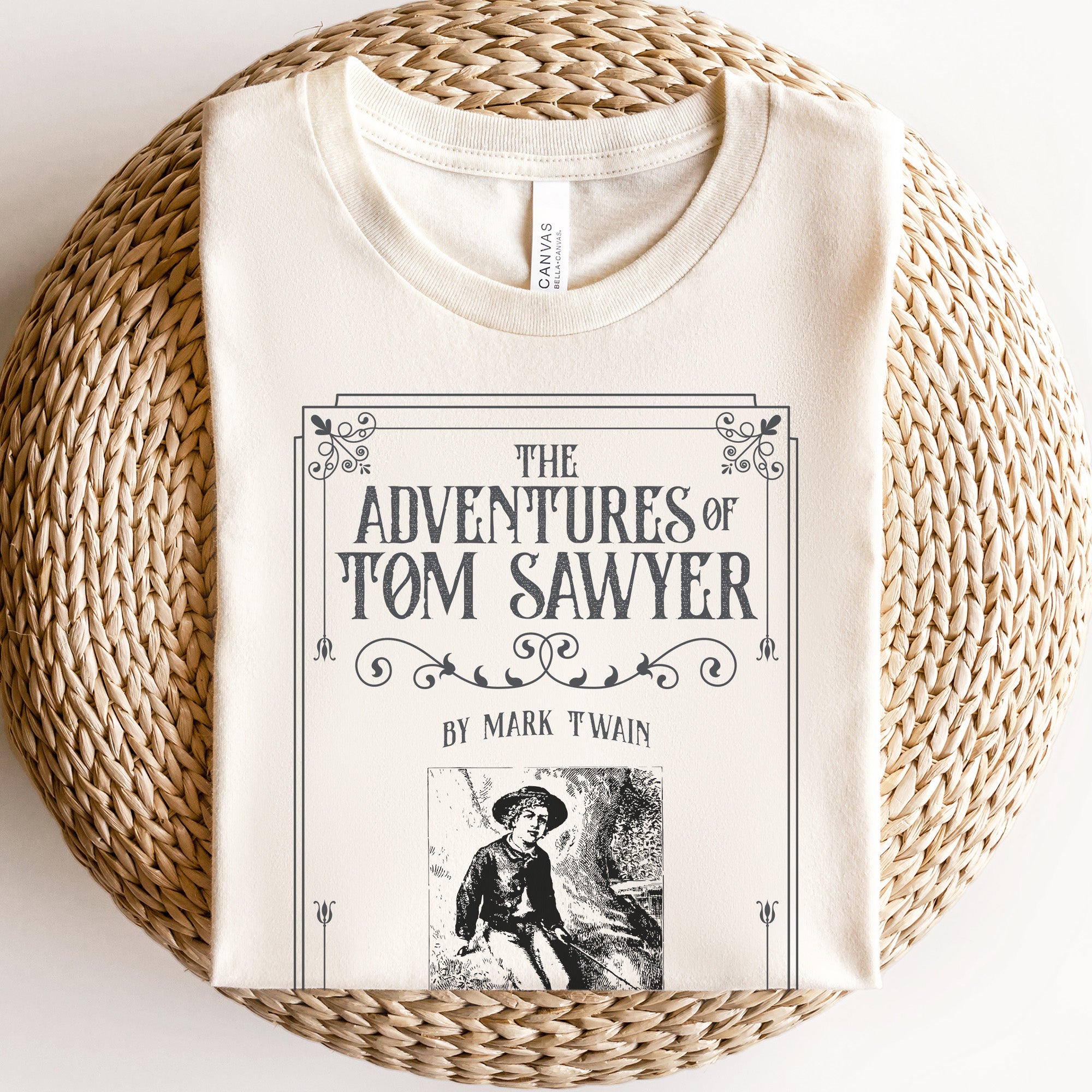 This Tom Sawyer shirt features the iconic illustration from the first English edition of the book from Mark Twain. It is inspired by the classic children's book. The book is now in the public domain.